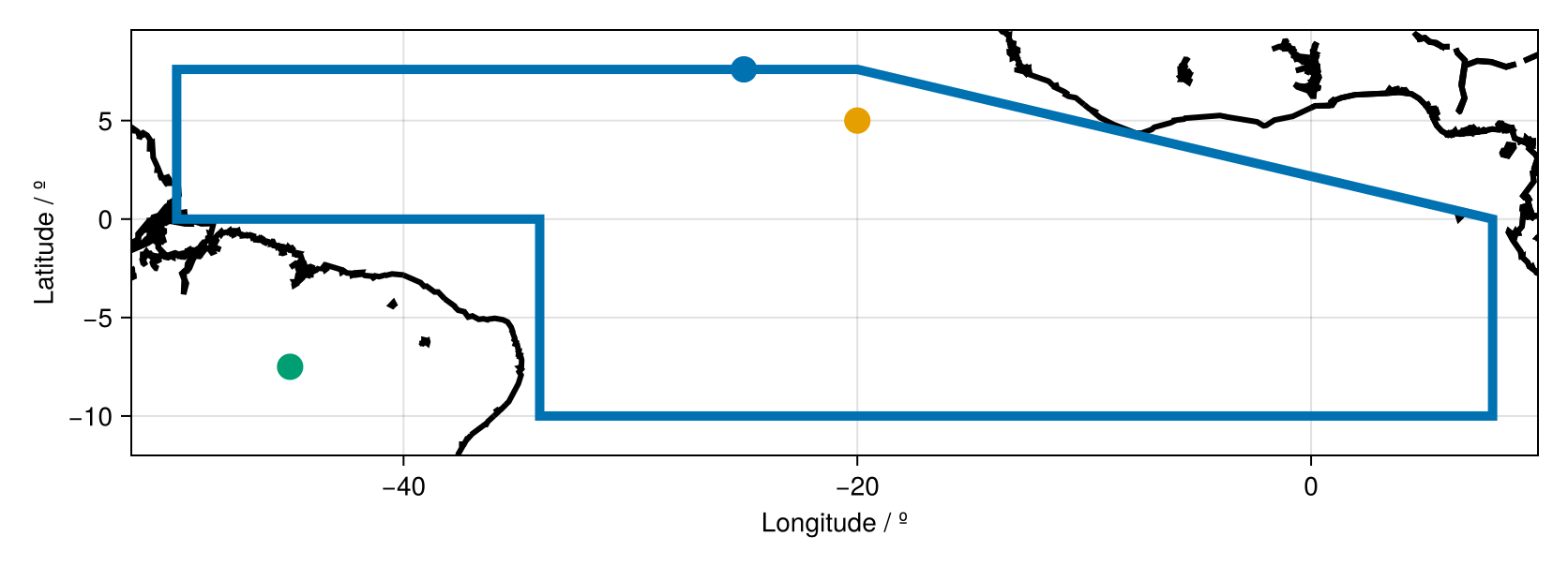 Shape (geometry.shape) : Vector{Point{2, Float64}}(8)So here, we have circshifted the lon and lat values used to define the GeoRegion such that instead of the start/end points being at (-34,-10), now the start/end points are at (-50,0).